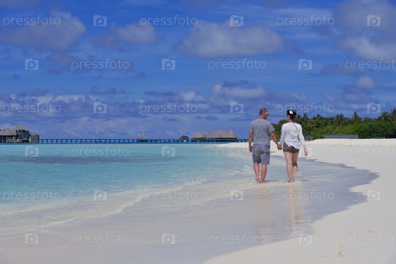 Счастливая молодая пара весело проводит время и отдыхает на пляже в летнем отпуске