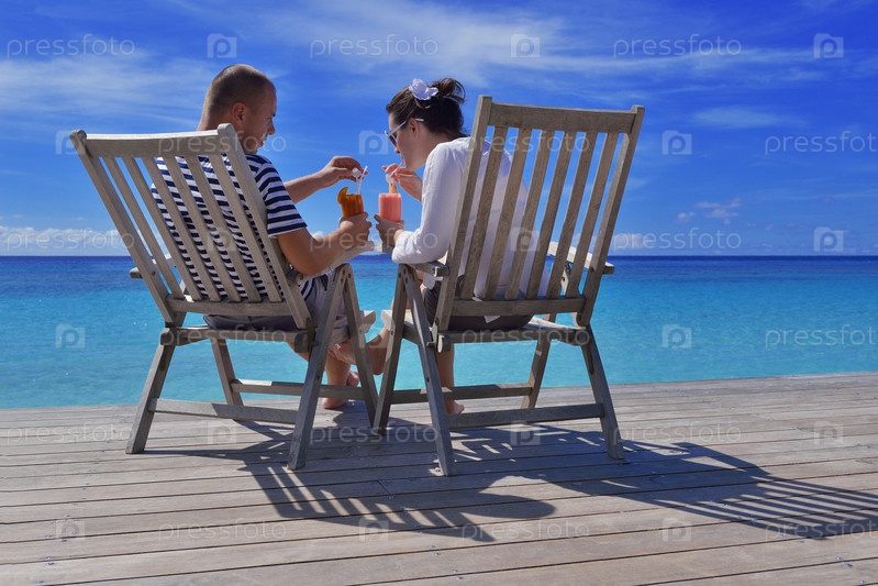 Счастливая молодая пара отдыхает и пьет освежающие напитки