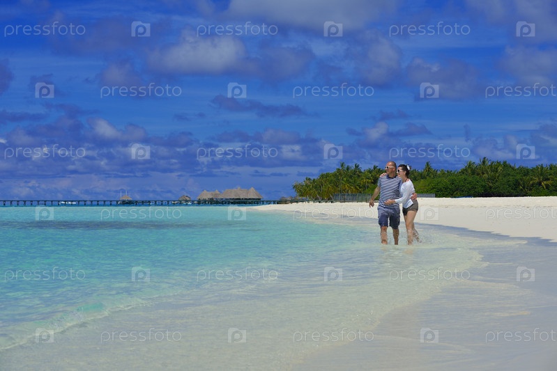 Счастливая молодая пара весело проводит время и отдыхает на пляже в летнем отпуске