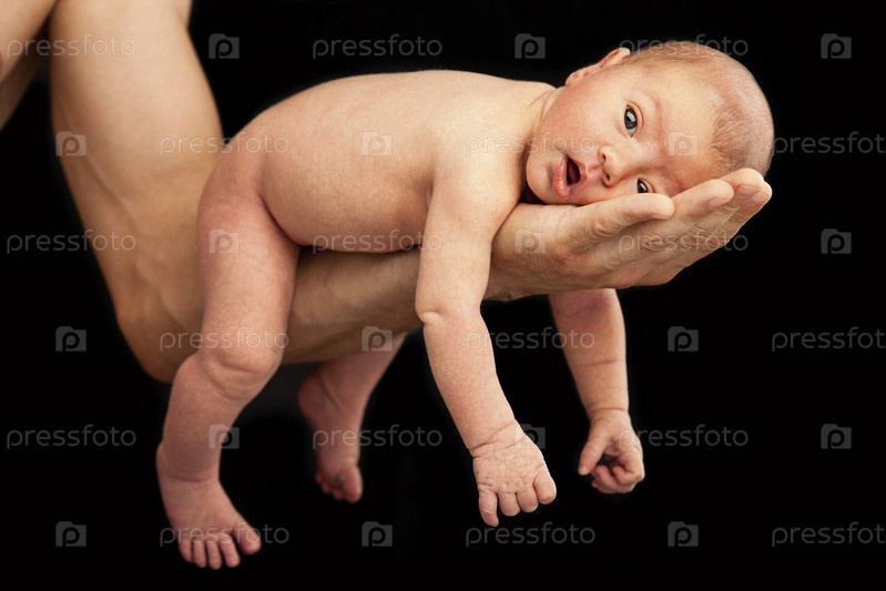 Новорожденный мальчик, лежащий на руке отца