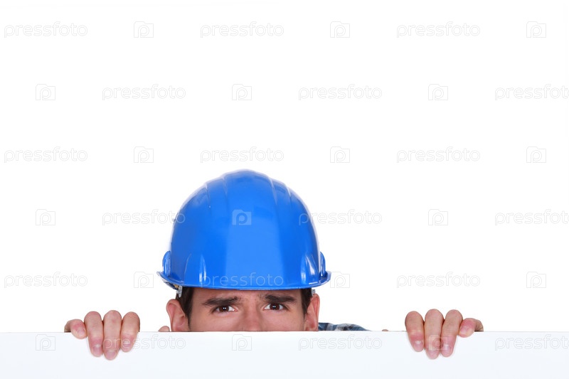 Строитель выглядывает из-за плаката
