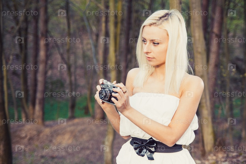 Красивая девушка с ретро фото-камерой