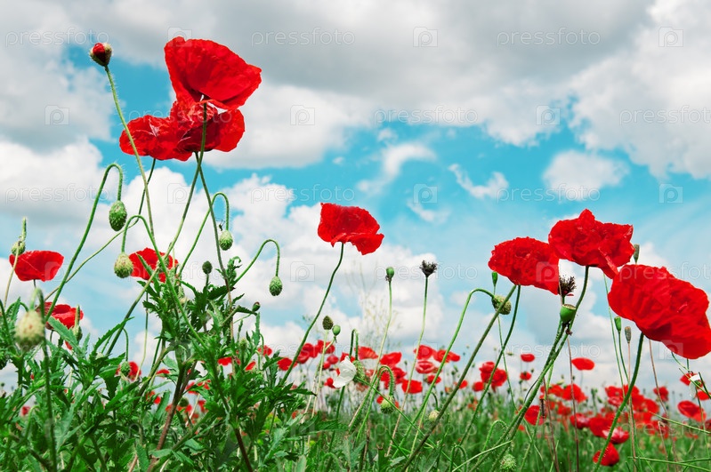 Алые маки на фоне облачного неба