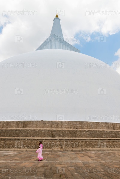 Женщина в сари идет возле круглой белой священной ступы высотой 103 метра