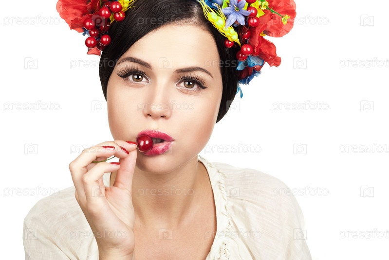 Девушка в венке целует ягоду
