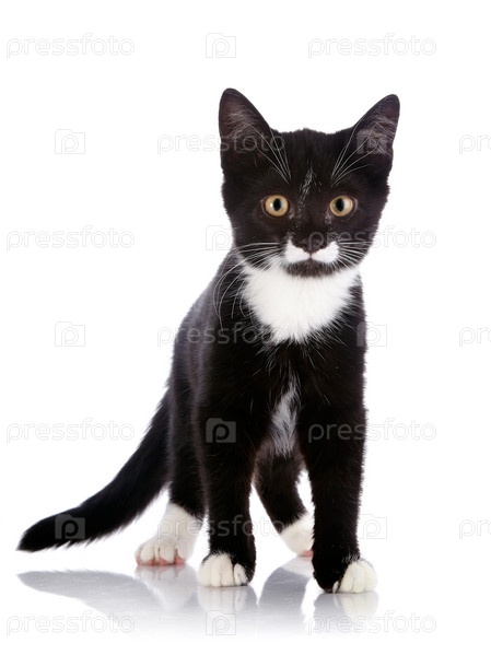 Черно-белый котенок идет на белом фоне