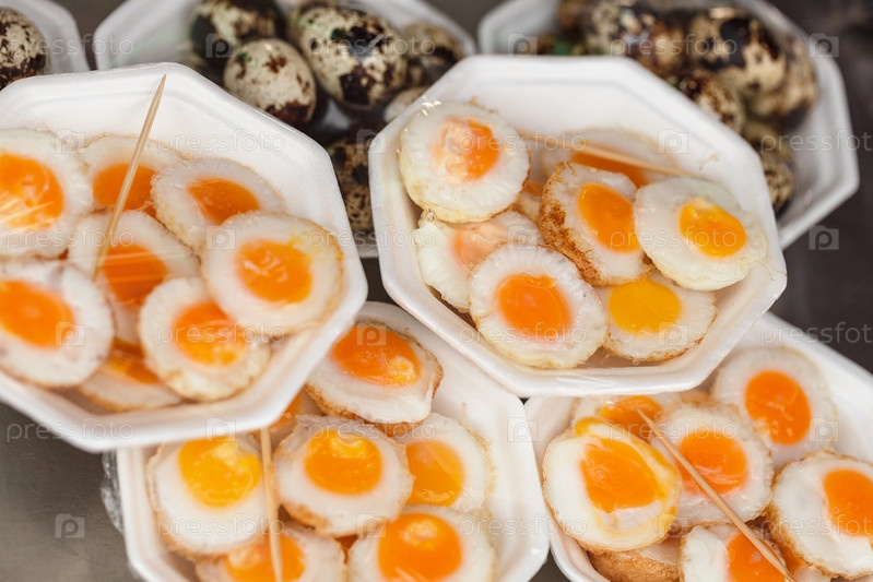 Яичница из перепелиных яиц и вареные яйца на рынке