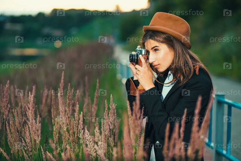 Красивая девушка-хипстер фотографирует