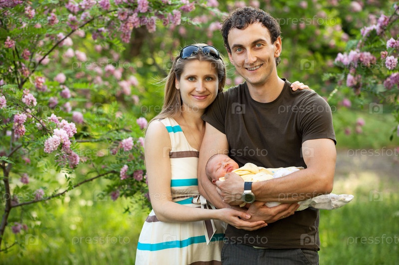 Молодая пара с новорожденным сыном на открытом воздухе весной