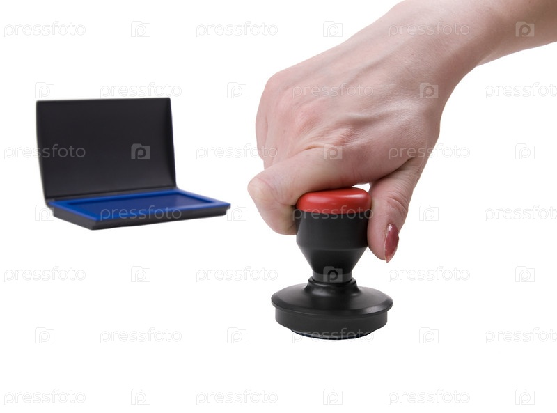 Рука с печатью для документов на белом фоне