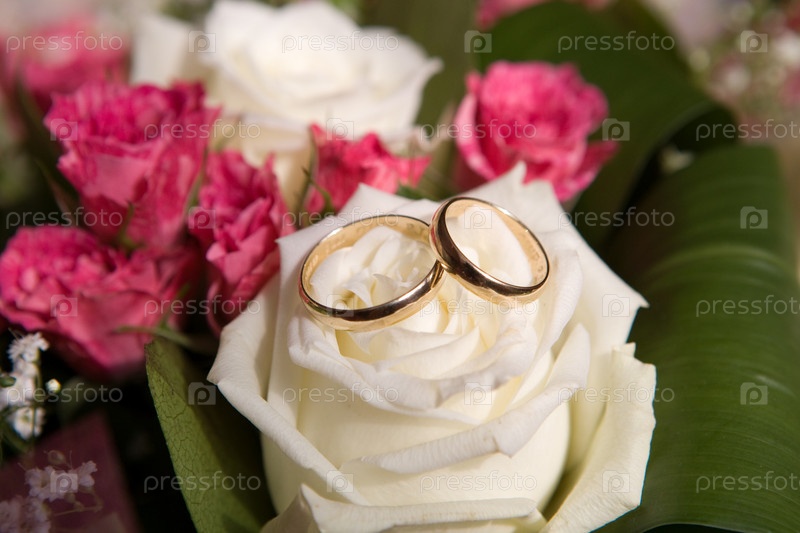 Два обручальных кольца на белой розе крупным планом