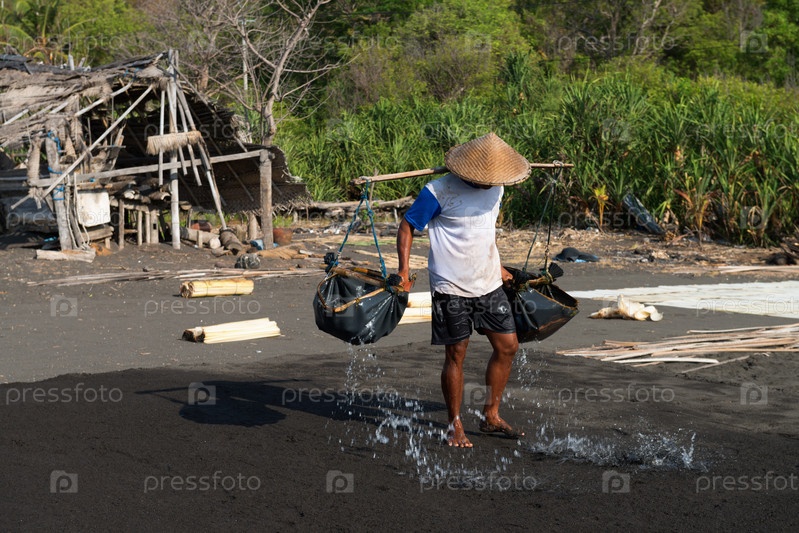 Традиционное производство морской соли на вулканическом черном песке, Бали, Индонезия