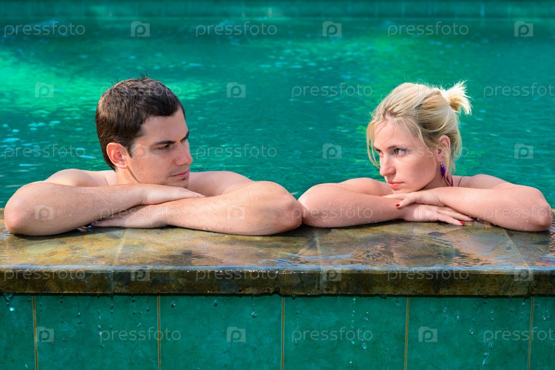 Грустная и несчастная пара в плавательном бассейне