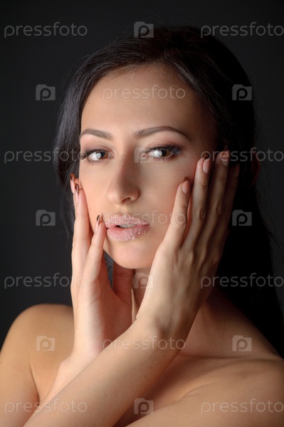 Портрет молодой привлекательной брюнетки с руками на лице и сахаром на губах на черном фоне