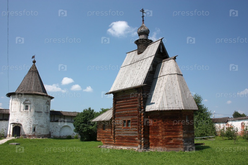 Деревянная Георгиевская церковь (18 век) и башня в Михайло-Архангельском монастыре. Россия, Владимирская область, Юрьев-Польский. Золотое кольцо России