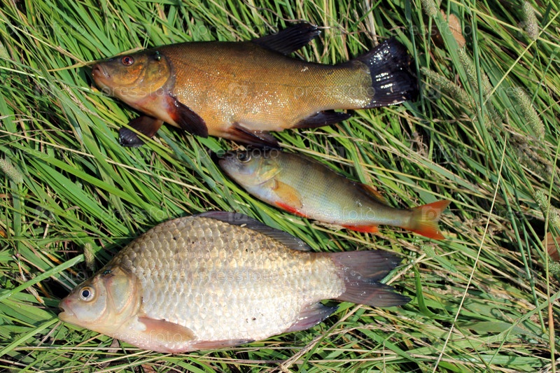 Пойманная рыба линь, окунь и карась