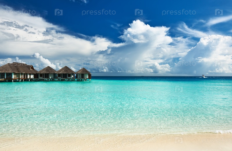 Красивый пляж с водными бунгало