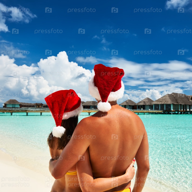 Пара в шапках Санта-Клауса на пляже на Мальдивах