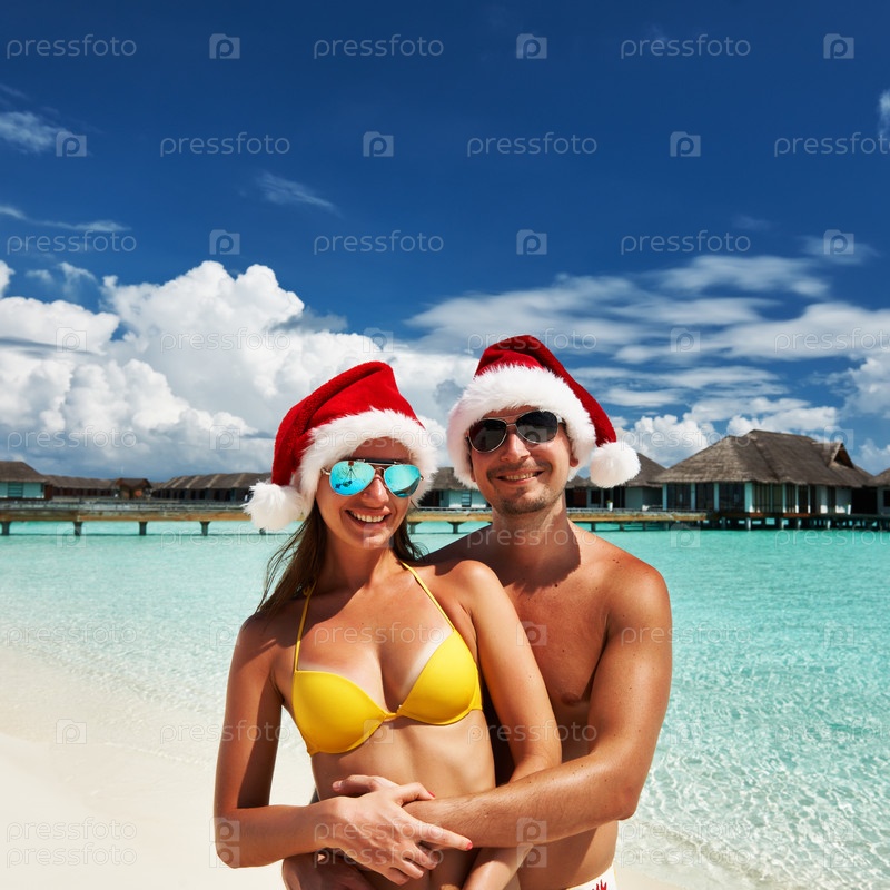 Пара в шапках Санта-Клауса на пляже на Мальдивах