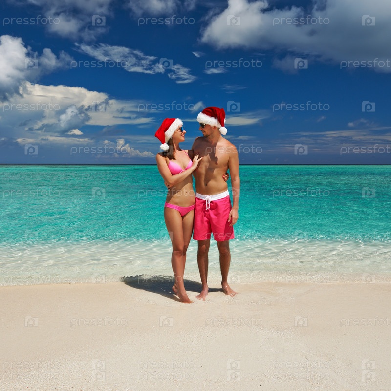Пара в шапках Санта-Клауса на пляже на Мальдивах