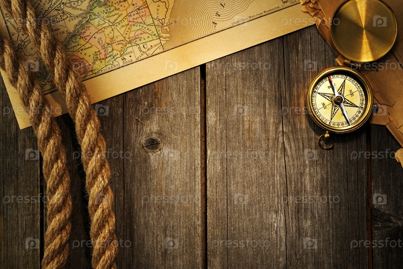 Старинный компас и веревка над старой карте
