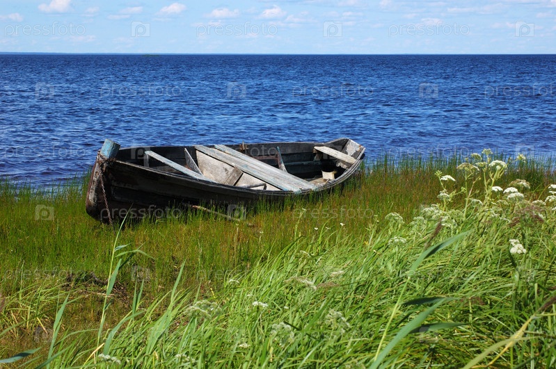 Старая лодка на берегу озера