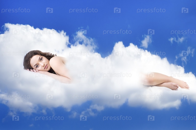 Красивая женщина, лежащая на облаке