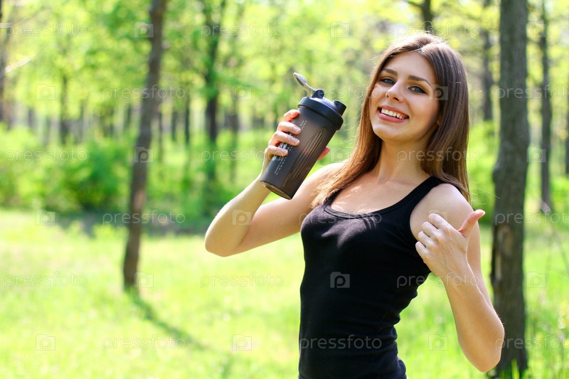 Молодая женщина держит бутылку воды и показывает большой палец