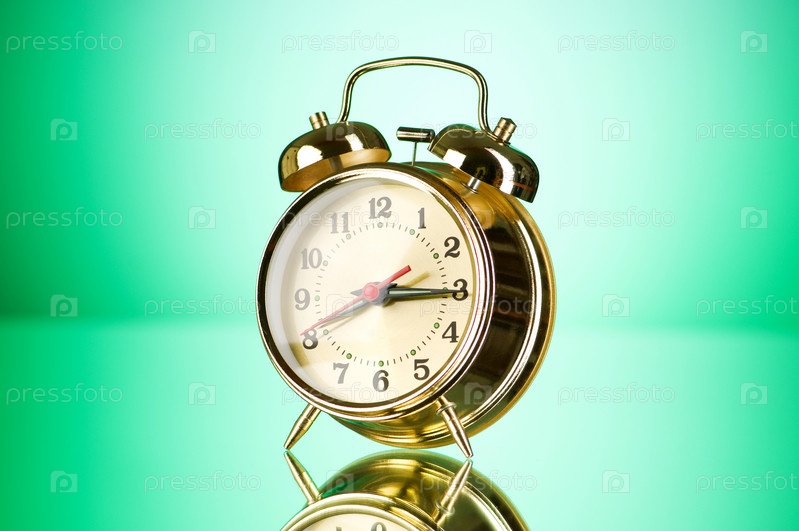 Золотой будильник на зеленом фоне