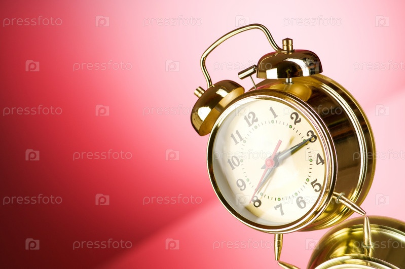 Золотой будильник на красном фоне