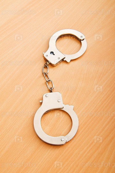 Металлические наручники на деревянном столе