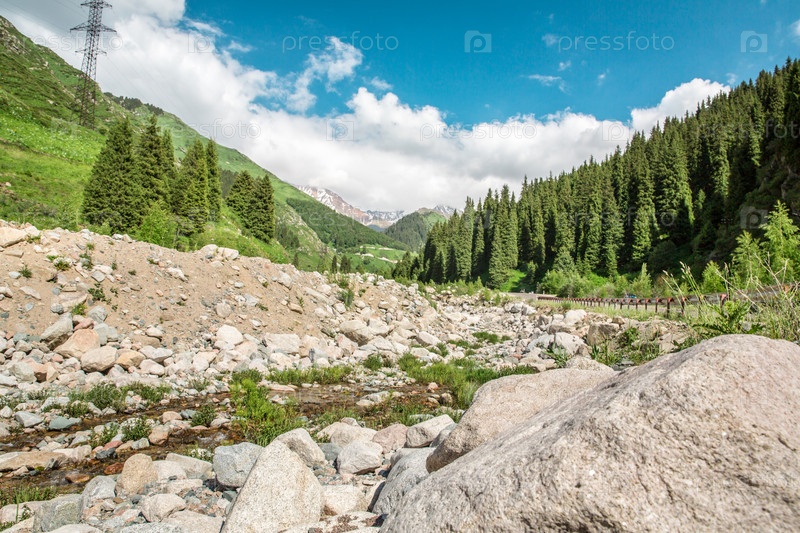 Дорога на Большое Алматинское озеро, зеленые горы и голубое небо, Алматы, Казахстан, Азия