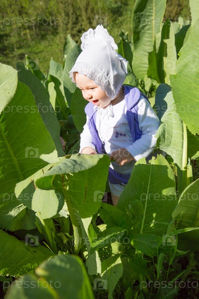 Улыбающаяся маленькая девочка в листьях лопуха в парке