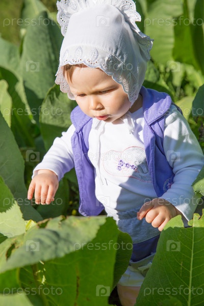 Очаровательная маленькая девочка в зеленой траве летом, Алматы, Казахстан