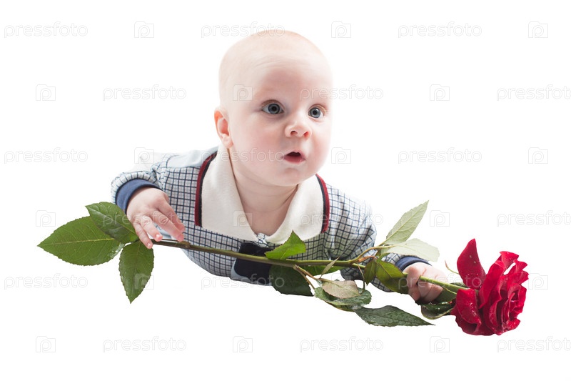 Очаровательный маленький мальчик с розой, изолированный на белом фоне. Младенцы и дети