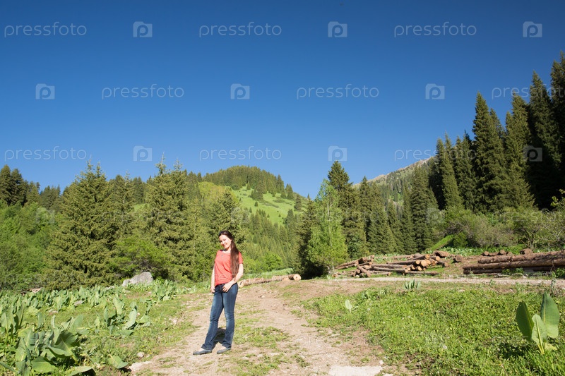 Женщина с длинными волосами на природе вблизи Медео в Алматы, Казахстан, Азия