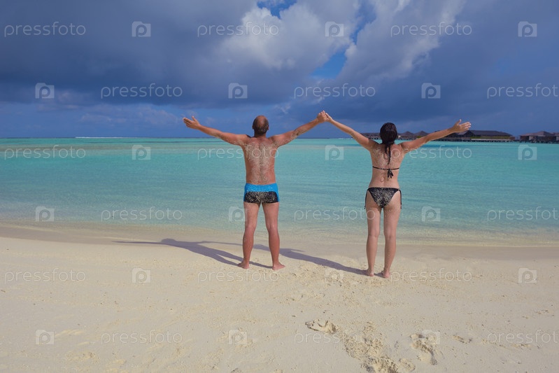 Счастливая молодая пара на летних каникулах весело проводит время и расслаблятся на пляже