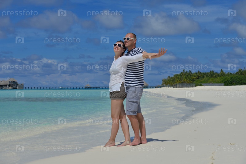 Счастливая молодая пара весело проводит время на летних каникулах на пляже