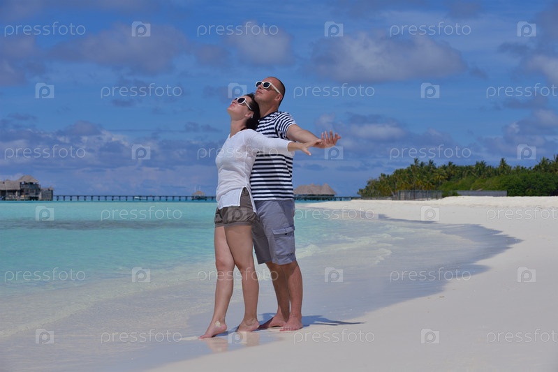 Счастливая молодая пара весело проводит время на летних каникулах на пляже