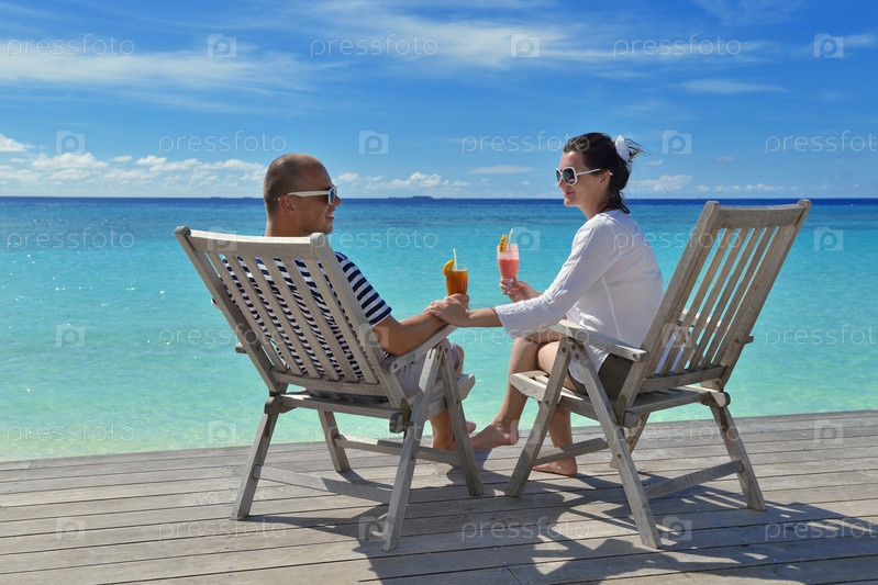 Счастливая молодая пара отдыхает и пьет освежающие напитки