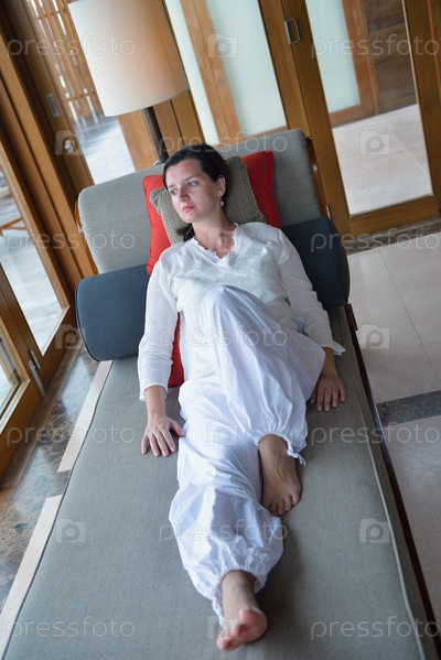 Счастливая молодая женщина отдыхает дома на диване