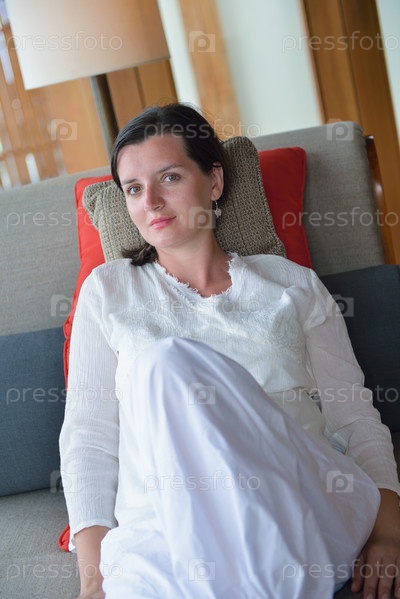 Счастливая молодая женщина отдыхает дома на диване