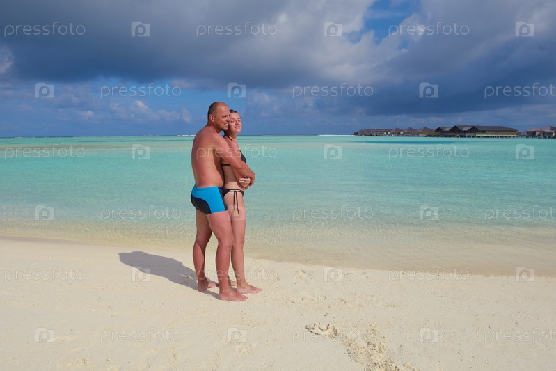 Счастливая молодая пара весело проводит время на летних каникулах на пляже