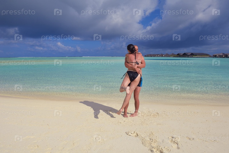 Счастливая молодая пара весело проводит время на летних каникулах на пляже