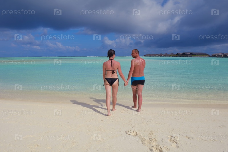 Счастливая молодая пара весело проводит время и отдыхает на пляже