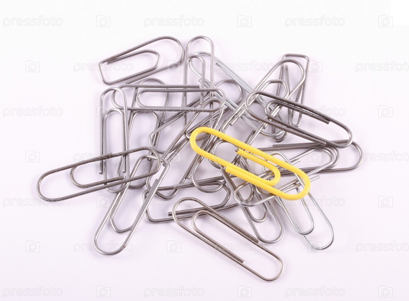 Металлические и одна желтая скрепки на сером фоне
