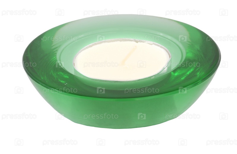 Свеча в подсвечнике из зеленого стекла на белом фоне