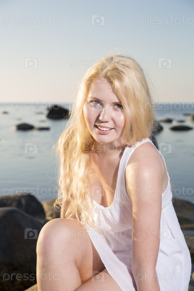 Женщина в белом платье позирует на берегу моря