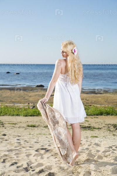 Молодая женщина с шалью идет по песку
