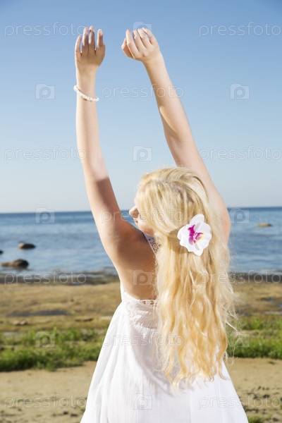 Молодая женщина тянет длинные руки к небу